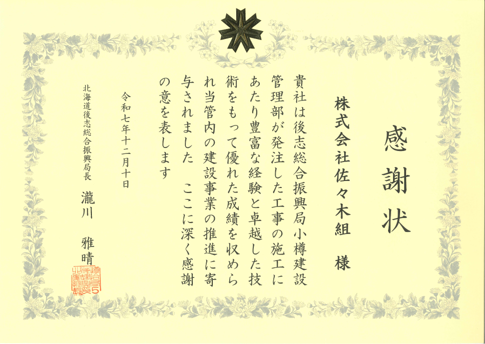 この受賞は、令和6年度に完工した工事において、優れた成績を収めたことが評価されたものです。これらの工事を通じて建設事業の推進に貢献したことが、北海道後志総合振興局長より感謝状を賜る結果となりました。私たちの技術力とプロジェクトへの取り組みが高く評価された証であり、大変光栄に思っております。
